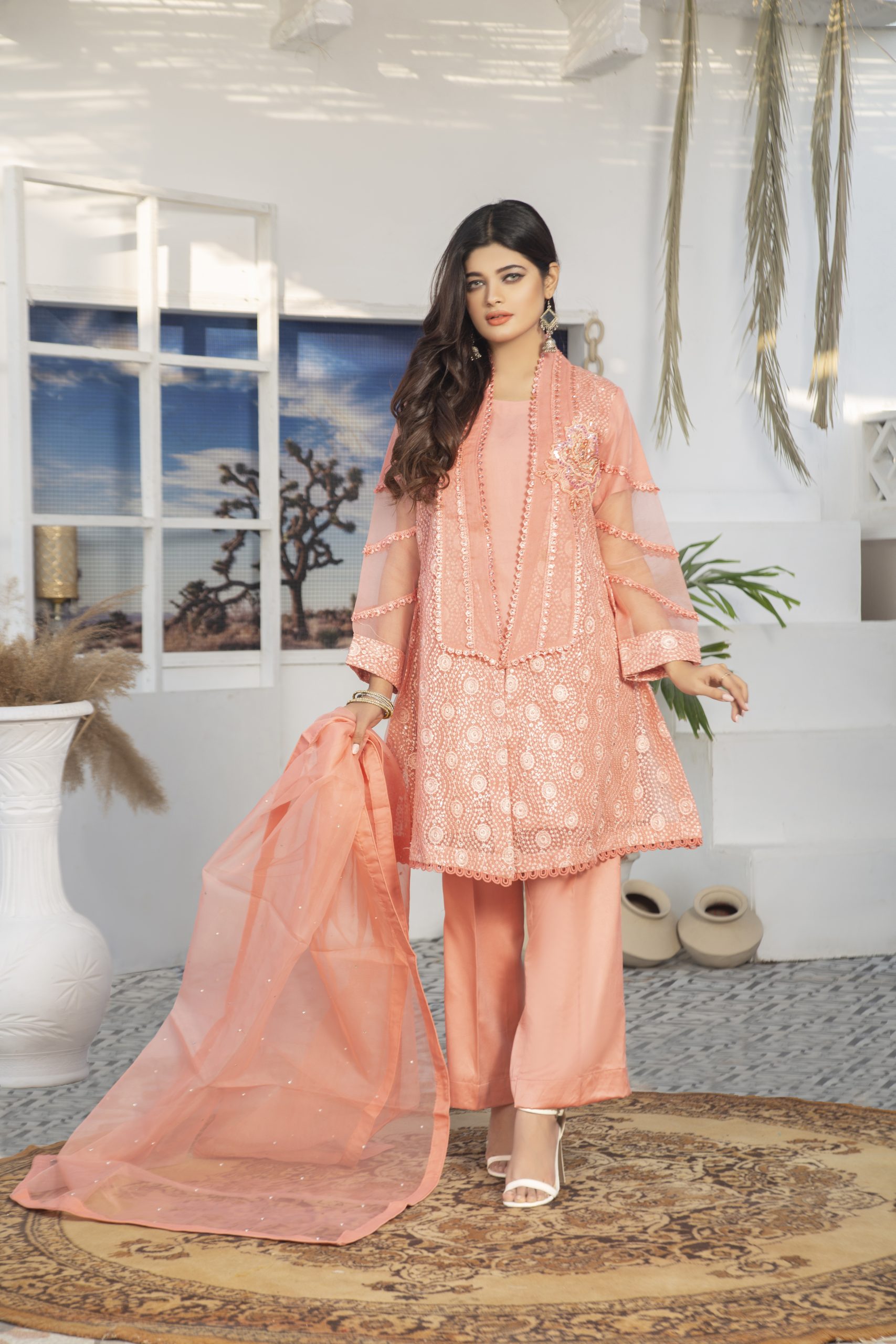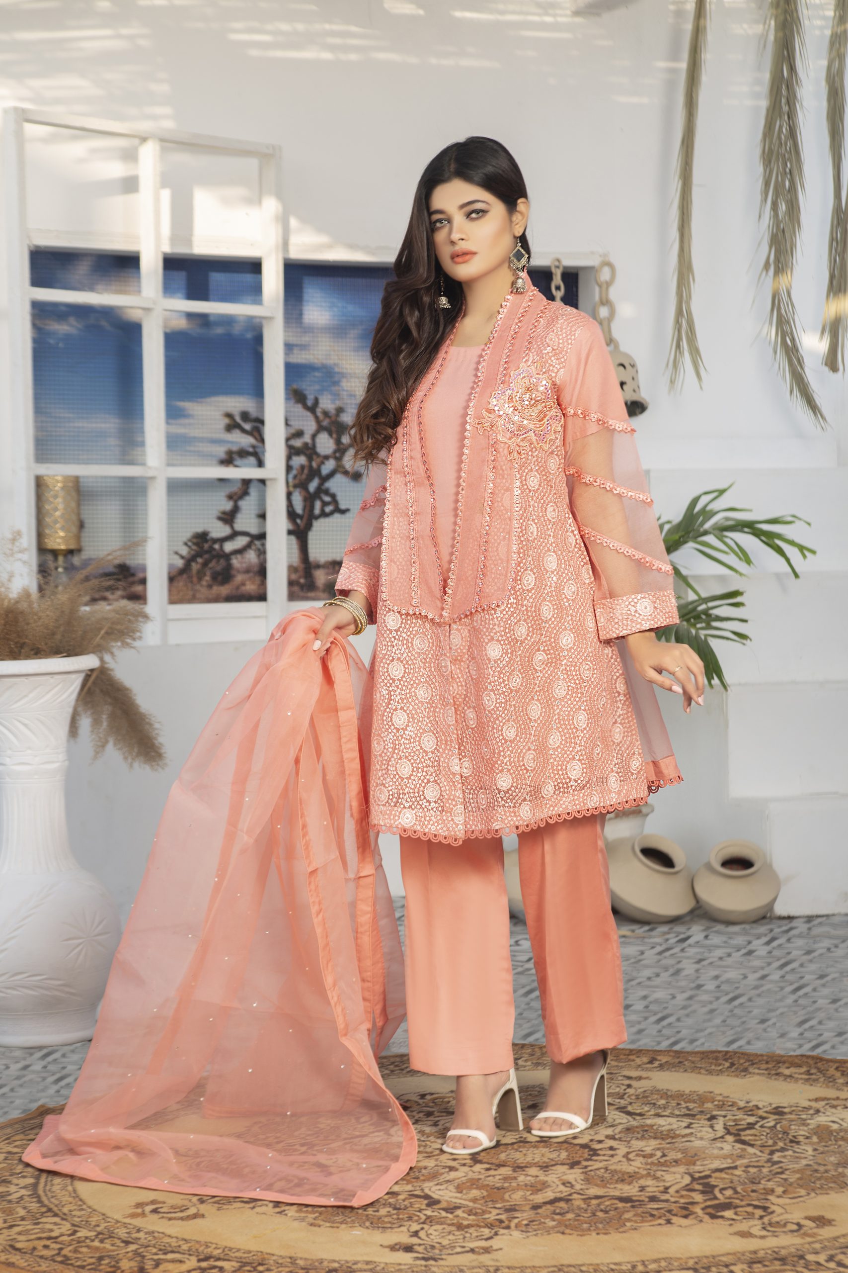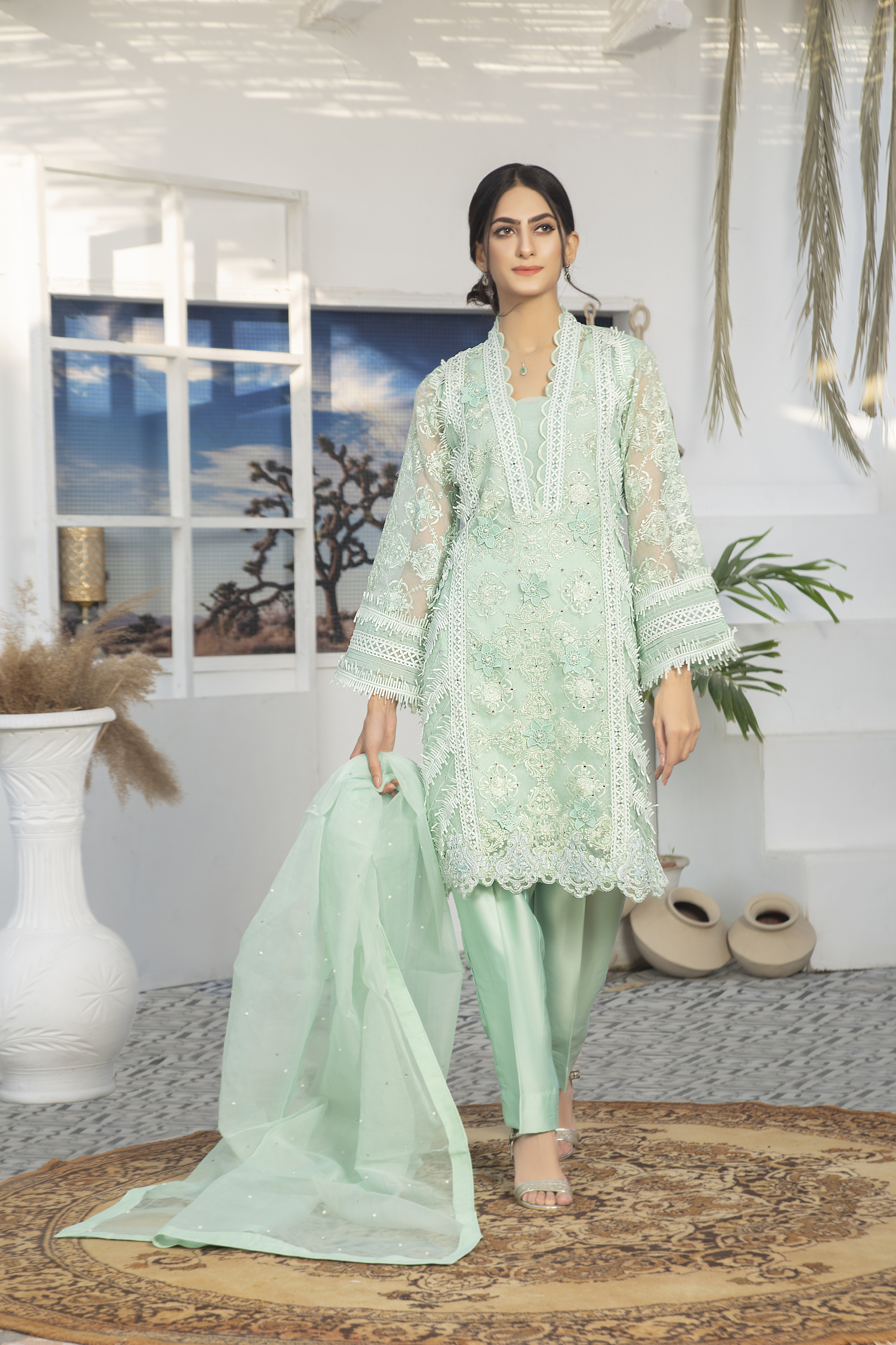 Stylish n simple outfit for a women who wants to dress up in a minimal but in different way. The straight shirt made in organza fabric with lacy n 3d flower work on it.