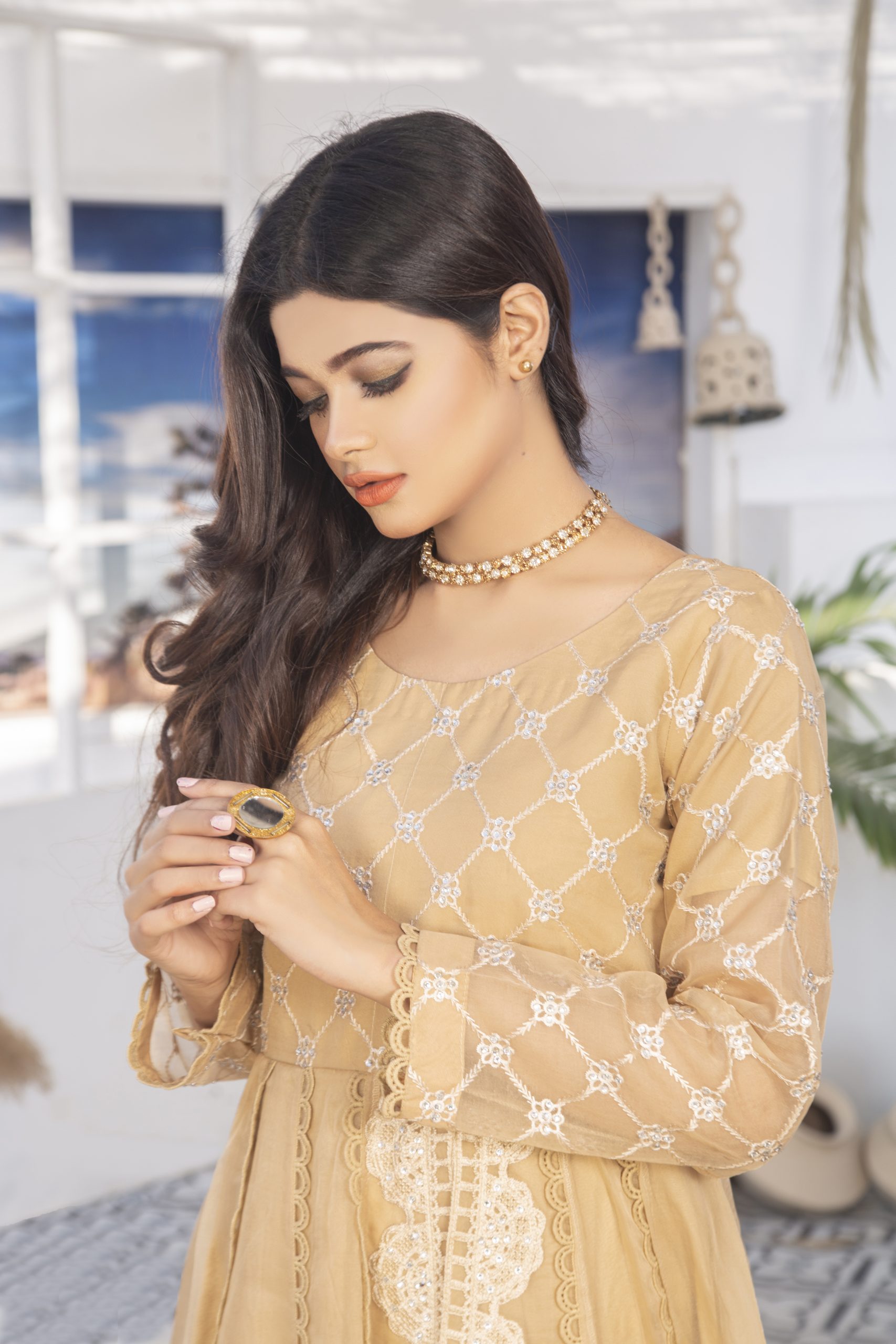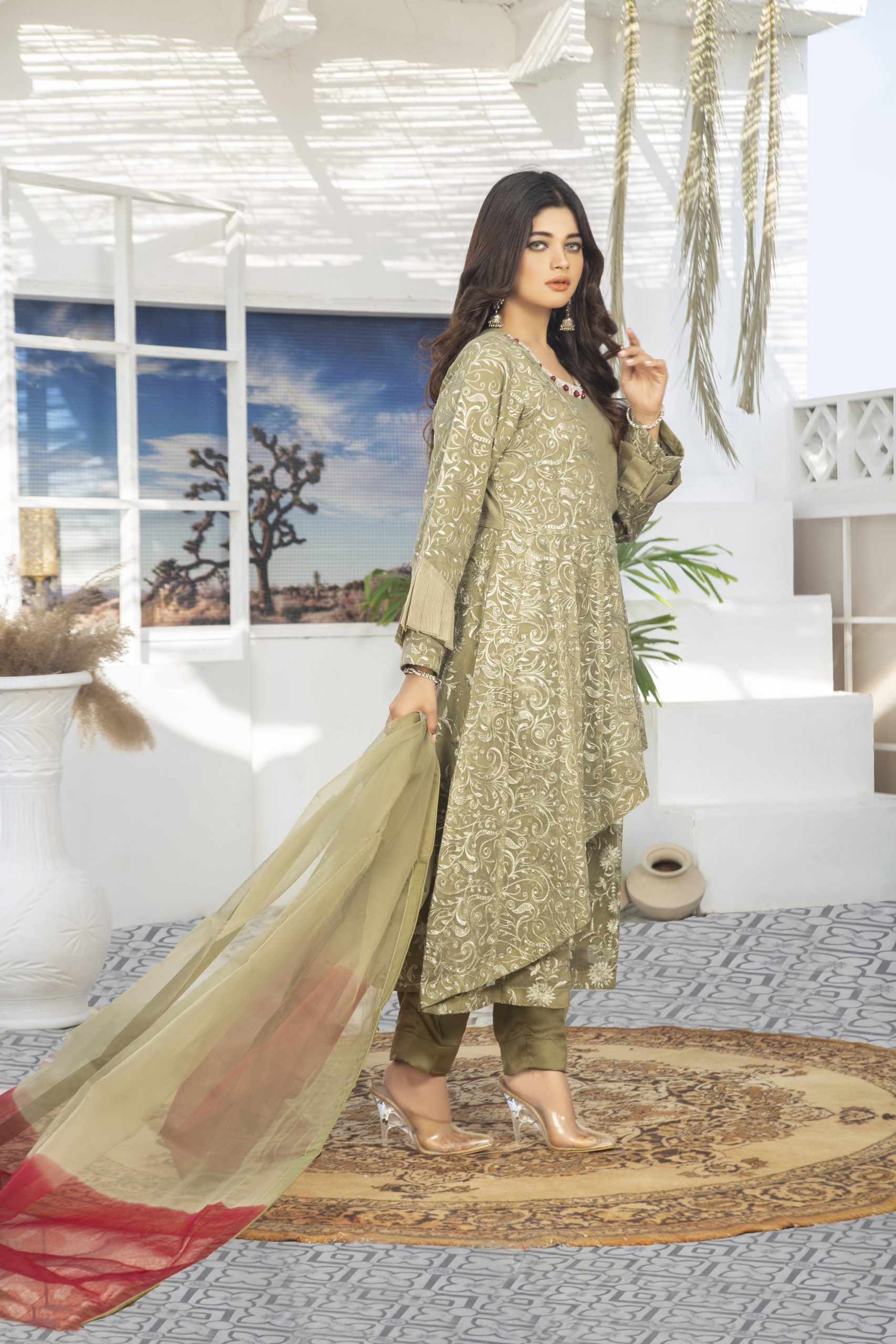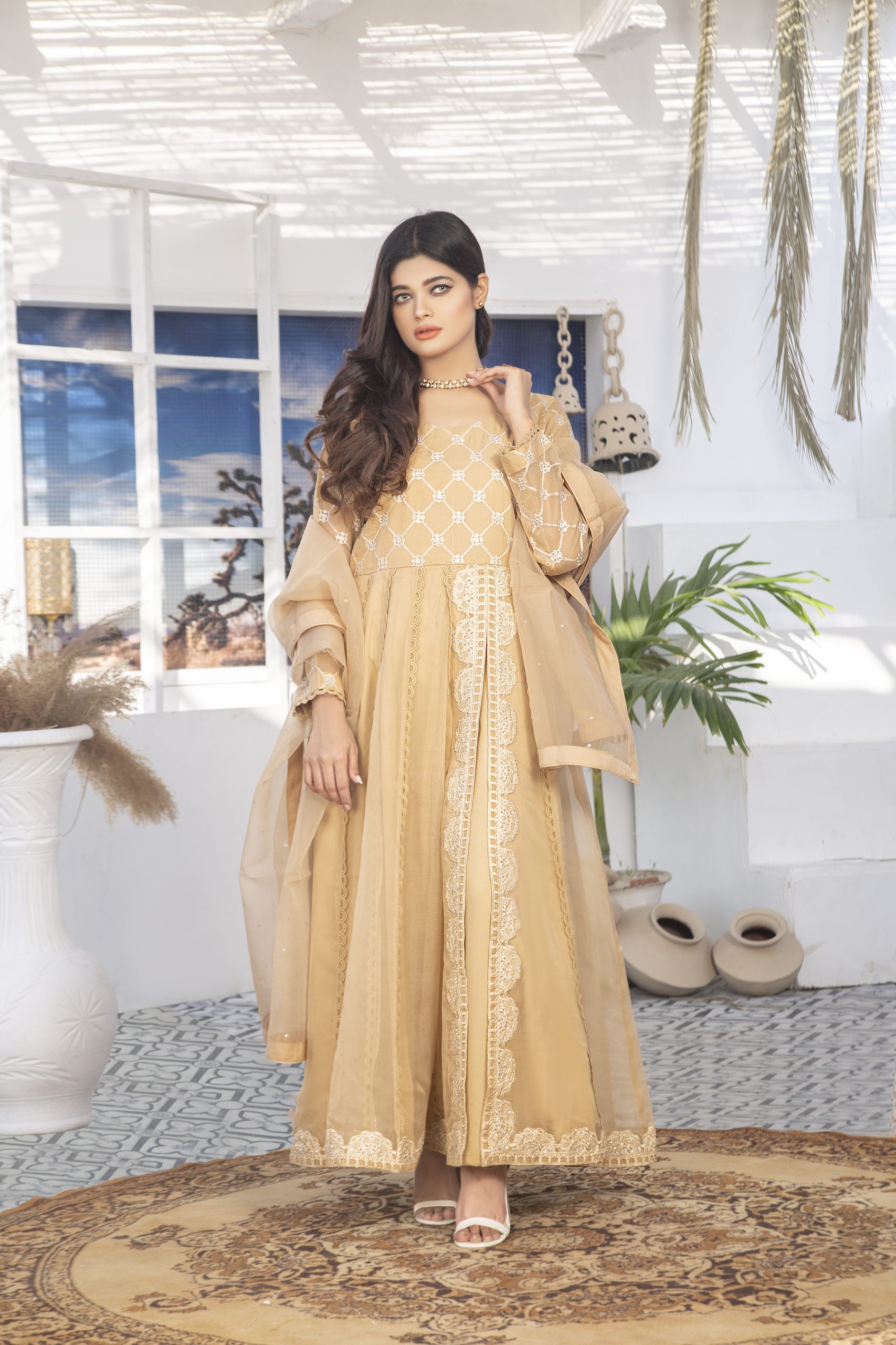 Stylish n simple outfit for a women who wants to dress up in a minimal but in different way. The straight shirt made in organza fabric with lacy n 3d flower work on it.